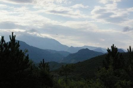 In Podgorica (kyrillisch Подгорица; Aussprache [ˈpɔdgɔˌriʦa]) gibt es keinen Campingplatz und es wäre zu dunkel, um weiterzufahren. So schlagen wir unser Zelt in einem Wald vor der Stadt auf. Wald heißt in diesem Wald Pinienwald ohne jeden Sichtschutz. Es ist ein theoretisch richtig schöner Wald, der leider als Müllkippe verwendet wird. Es sind überall Wege gefahren und Müllberge liegen herum. Wir zählen mindestens vier wilde Hunde und einen Esel. Zudem stehen viele Autos rum. Also vermuten wir, dass der Satz „Ich bring mal den Müll runter“ in Podgorica eine andere Bedeutung hat…. Andererseits sind beschäftigte Menschen in Autos im Wald besser als gelangweilte mit oder ohne Auto. So hoffen wir auf eine gute Nacht. Im Hintergrund sind schon diech albanischen Berge zu sehen, die uns morgen erwarten.