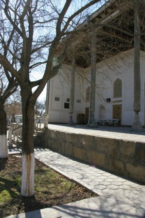 Nachdem das Mittagsgebet (acht Männer), zu dem ein jüngerer Mann mit leiser Stimme außerhalb der Moschee gerufen hatte (in Usbekistan ist es den Muezzin verboten, vom Minarett zum Gebet zu rufen), können wir uns den Innenraum anschauen. Er ist schlicht und doch aufwendig und wirklich schön.